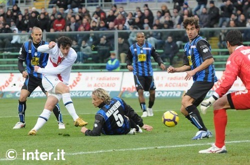 Milito, rimontata da quella di Tiribocchi nella ripresa. PRIMO TEMPO - L'Inter, in campo con la maglia rossocrociata del centenario, si propone in avanti al minuto 3 con un tiro di Maicon dalla distanza che Coppola, nuovamente titolare al posto di Consigli, raccoglie con sicurezza. Al 6' sul calcio di punizione di Sneijder intercetta Lucio sul secondo palo, ma la conclusione è alta. L'Atalanta risponde con Ferreira Pinto che prova il tiro dalla distanza, palla a lato. All'11 Rizzoli assegna un calcio di punizione ai bergamaschi per un presunto fallo di mano di Zanetti, colpito in realtà in faccia; sugli sviluppi della punizione battuta dalla sinistra, Bellini calcia di potenza, la deviazione di Cambiasso crea pericoli a Julio Cesar che devia in corner con i piedi e con estrema lucidità. Al 15' Inter in vantaggio grazie alla bellissima rete di Milito: su assist di Sneijder, il principe, riesce a trovare il varco in mezzo a tre avversari e a beffare Consigli con un rasoterra beffardo. Decimo gol per l'attaccante argentino che, ancora una volta, dentro l'area non perdona. Al 18', l'Atalanta reclama un calcio di rigore per un controllo di braccio di Lucio sul pallone controllato da Ceravolo: dalle immagini si nota come, in realtà, il difensore brasiliano respinga nettamente con lo stomaco, ma è la palla a rimbalzare in un secondo momento sul gomito che, però, è attaccato al corpo e non aumenta quindi lo spazio di protezione. Alla mezz'ora bello spunto di Balotelli che, sul passaggio di Sneijder, prova il tiro dopo una finta, ma la palla termina a lato. Al 33' l'Inter guadagna un calcio di punizione per il fallo, da giallo, di Garics su Eto'o; il tiro perfetto di Sneijder s'infrange sulla traversa. Dal minuto 42 serie di occasioni per entrambe le squadre: Eto'o crossa sul secondo palo, dove per un soffio Balotelli non raccoglie, mentre davanti a Julio Cesar, Cambiasso chiude in corner il bel cross rasoterra di Ceravolo. Solo sul finale del primo tempo (45'), si fa vedere Acquafresca, la punta ex Inter ci prova con un tiro dal limite che diventa preda di Julio Cesar. Dopo un minuto di recupero, squadre a riposo sullo 0-1. SECONDO TEMPO