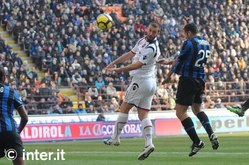 Cambiasso sul passaggio dalla destra di Milito. Il Cagliari risponde