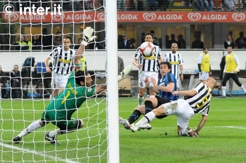 per l'Inter, con Maicon che dalla destra serve Milito: il destro dell'argentino,