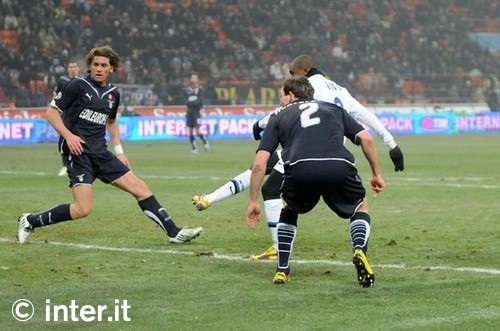 PRIMO TEMPO - Al 4' è l'Inter a proporsi in avanti con un sinistro dalla distanza di Thiago Motta, Muslera non trattiene, ma interviene Stendardo che devia in corner. Al minuto 6 Radu atterra Maicon in area con una spinta, per Russo è tutto regolare. La Lazio risponde al 13' con Kolarov che in percussione personale arriva davanti a Julio Cesar e, da posizione defilata, conclude direttamente sul portiere brasiliano. Al 14' Eto'o porta l'Inter in vantaggio: sul contropiede nerazzurro, Stankovic raccoglie palla e crossa dalla sinistra per il camerunese sotto porta che al secondo tentativo, dopo il colpo di testa ribattuto, brucia Muslera mirando la parte alta della rete. Al 23', Thiago Motta commette fallo su Baronio, Rocchi lo ammonisce dopo aver però graziato 7 minuti prima Stendardo, autore di una bruttissima entrata su Milito. Al 25' Muntari rimane a terra per un problema muscolare e abbandona il campo poco dopo, al suo posto c'è Patrick Vieira. Al 30' è invece Lucio ad avere problemi al ginocchio destro dopo il fallo di Baronio che viene ammonito, il brasiliano però sembra in grado di continuare. Al 35' la Lazio sfiora il pareggio, sul calcio di punizione di Kolarov, Maicon tocca involontariamente con una mano, la palla torna in possesso dei biancocelesti, Meghi sotto porta spedisce sul fondo. Al 39' doppia occasione per l'Inter, prima con il calcio di punizione di Thiago Motta che Cambiasso intercetta in contro balzo, poi con il potente destro di Milito dal limite che termina a lato. Al 44' Cordoba salva il risultato arpionando e sottraendolo il pallone dopo il lancio di Del Nero e rubando palla a Rocchi. Dopo 2' minuti di recupero, squadre a riposo sull'1-0. SECONDO TEMPO