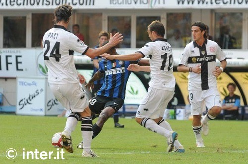 Dopo due settimane di stop, ricomincia il campionato e l'Inter torna a vincere. Lo fa battendo il Parma 2-0 allo stadio 'Giuseppe Meazza' di San Siro in una gara bloccata fino all'inizio del secondo tempo. Dopo un primo tempo chiuso sullo 0-0, infatti, il match cambia volto con Mario Balotelli in campo, con la genialità di Samuel Eto'o che al 26' inventa una magia e porta l'Inter in vantaggio e con il tocco leggero quanto importante del principe Milito. Balotelli a un passo dal tris. PRIMO TEMPO - Con Dejan Stankovic e Cristian Chivu out per un attacco febbrile, José Mourinho si affida a Julio Cesar tra i pali dietro ai quattro uomini della difesa, Maicon, Lucio, Samuel e Santon. Centrocampo affidato a Vieira, Zanetti e Thiago Motta, mentre Wesley Sneijder, alla seconda partita da titolare in nerazzurro, è il trequartista dietro le due punte Milito ed Eto'o. Dopo 4 minuti di gioco primo spunto del Parma con Mariga che ci prova da fuori area, Julio Cesar costretto a deviare in rimessa laterale. Al 7' si fa vedere invece l'Inter: velo di Sneijder per Eto'o, il camerunese riesce a caricare il destro, ma il tiro è ribattuto dal corpo di Panucci. Il primo vero brivido della partita è nerazzurro all'11 grazie al gran tiro di esterno destro di Sneijder, Mirante fa il miracolo e para a mano aperta deviando in calcio d'angolo. Sugli sviluppi, grande spunto di testa di Thiago Motta per Eto'o che sfiora nuovamente il gol. Al 20' Sneijder dimostra tutta la sua classe con un disimpegno che gli vale un bell'assist per Maicon prima che la difesa emiliana spenga l'azione. L'Inter pressa alto e costringe il Parma nella propria metà campo e anche i lanci lunghi degli avversari creano pochi pensieri , vedi il tiro altissimo di Mariga al 23'. Al 25' Galloppa, già ammonito, atterra con violenza Maicon al limite dell'area, il brasiliano è costretto a ricevere le cure mediche a bordo campo per rientrare dopo la battuta del calcio di punizione ad opera di Thiago Motta che centra la barriera. Al 36' grande azione di Milito spenta dal guardalinee che segnala una posizione irregolare dell'argentino, pochi istanti dopo Sneijder prova l'azione personale e conclude, da fuori area, verso Mirante ma non trova la porta. Morrone chiama in causa Julio Cesar al 39', ma il portiere brasiliano allontana ogni pericolo con una parata in due tempi. Dopo il 45' i nerazzurri insistono sull'asse Milito-Maicon ma, dopo due minuti di recupero, Rosetti fischia la fine del primo tempo di Inter-Parma. Squadre a riposo sullo 0-0. SECONDO TEMPO