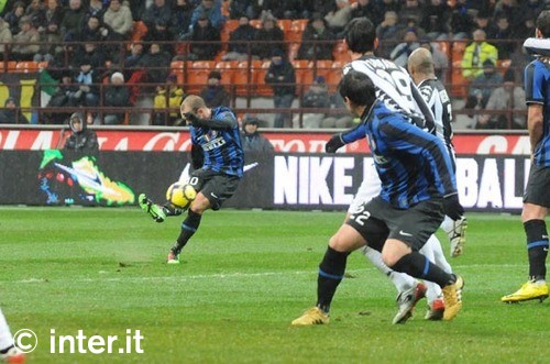un calcio di punizione dal limite: Sneijder sul pallone non sbaglia