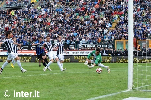 Morganti (sez. arbitrale Ascoli Piceno) È la rete di Diego Milito a permettere all'Inter di battere 1-0 il Siena sul campo dell''Artemio Franchi' e di conquistare il campionato 2009-2010 chiudendo la stagione a 82 punti in classifica. Il 18° scudetto, il quinto consecutivo, è il regalo dell'Inter per il presidente Massimo Moratti nel giorno del suo 65° compleanno e per tutti i tifosi nerazzurri che anche oggi hanno prima sofferto, fino a quella rete al 12° minuto della ripresa, poi gioito, subito dopo i tre punti conquistati contro un Siena già retrocesso, ma deciso a non far nessun regalo. PRIMO TEMPO - Per il match scudetto, José Mourinho rinuncia a Lucio e Chivu e, davanti a Julio Cesar tra i pali, schiera Materazzi e Samuel al centro della difesa nerazzurra con Maicon e Zanetti terzini. Centrocampo con Cambiasso e Thiago Motta arretrati rispetto al tridente che fa da spalla a bomber Milito, formato da Balotelli, Sneijder ed Eto'o. Dopo sei minuti di gioco, è il Siena ad sfiorare il vantaggio con Ekdal: aggirato l'ostacolo-Maicon e sfruttando il rimpallo sul tiro di Codrea, l'attaccante svedese prova il diagonale, ma la palla termina a lato. La risposta dell'Inter arriva al 13' ed è duplice: Balotelli prima raccoglie il cross di Maicon sfiorando il gol con un tiro di al volo d'interno destro, poi innesca l'avanzata devastante di Milito che prova far filtrare la palla alla sinistra di Curci lontano dai pali, ma la palla termina sul fondo. Ancora un'occasione per l'Inter al 22': Maicon è un treno sulla fascia destra ed è suo il cross che, dopo la sponda di Balotelli, permette a Milito la schiacciata di testa verso la porta bianconera, Curci è lucido e non si fa sorprendere. Al 28', il secondo calcio d'angolo a favore dell'Inter impegna Samuel che di testa spedisce palla sopra la traversa, ma ancora sul corner, è Thiago Motta, due minuti dopo a sfiorare l'1-0 sventato solo dalla pronta risposta di Curci. Il portiere bianconero, è soprattutto lui il protagonista del Siena, anche quando al 35', sul cross di Maicon spegne la grinta di Eto'o sotto porta. Al 37', Maccarone fa tutto da solo, è veloce e potente il suo sinistro, ma Julio Cesar c'è e para in due tempi, anticipando la risposta di Curci sulla spettacolare conclusione di Balotellli in semi rovesciata dopo il lancio lungo di Maicon. È il 40': al 'Bentegodi', Vucinic porta in vantaggio la Roma mentre al 'Franchi', è Jajalo - su assist di Vergassola - a creare pericoli con un destro a fil di palo (42'). Pieno recupero, la Roma fa il bis con De Rossi, Eto'o cerca il primo dell'Inter dopo il velo di Milito sull'assist di Cambiasso ma è sullo 0-0 che a Siena si chiude il primo tempo. SECONDO TEMPO