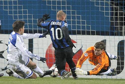 CHAMPIONS LEAGUE 2009/10 Kiev (Ucraina), 04 novembre 2009 - IV° giornata girone F Dinamo Kiev - Inter 1 - 2 Dinamo Kiev: Bogush, Eremenko, Khacheridi, Almeida, Magrao, Mikhalik, Vukojevic, Shevchenko, Ninkovic, Yarmolenko, Milevskiy (70' Gusev). A disposizione: Rybka, Betao, Ghioane, Kravets, Mandzyuk, Zozulya. Allenatore: José Mourinho Inter: Julio Cesar, Maicon, Lucio, Samuel (79' Muntari), Chivu (46’ Balotelli), J. Zanetti, Cambiasso (46' Thiago Motta), Stankovic, Sneijder, Milito, Eto'o. A disposizione: Toldo, Vieira, Materazzi, Mancini. Allenatore: José Mourinho Reti: 21' Shevchenko, 86' Milito, 89' Sneijder Arbitro: Bertrand Layec (Francia) Note: l'Inter