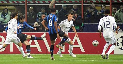 CHAMPIONS LEAGUE 2009/10 Milano, 24 febbraio 2010 - andata ottavi di finale Inter - Chelsea 2-1 Inter: Julio Cesar, Maicon, Lucio, Samuel, J. Zanetti, Stankovic (84' Muntari), Cambiasso, Thiago Motta (58' Balotelli), Sneijder, Eto'o (67' Pandev), Milito. A disposizione: Toldo, Cordoba, Quaresma, Mariga. Allenatore: José Mourinho Chelsea: Cech (62' Hilario), Ivanovic, Carvalho, Terry, Malouda, Ballack, Mikel, Lampard, Anelka, Drogba, Kalou (78' Sturridge). A disposizione: J. Cole, Alex, Belletti, Bruma, Borini. Allenatore: Carlo Ancelotti Reti: 3' Milito, 51' Kalou, 55' Cambiasso Arbitro: Mejuto Gonzalez (Spagna) Note: è