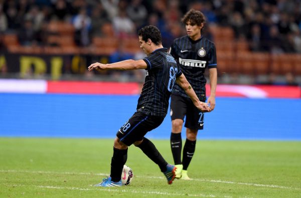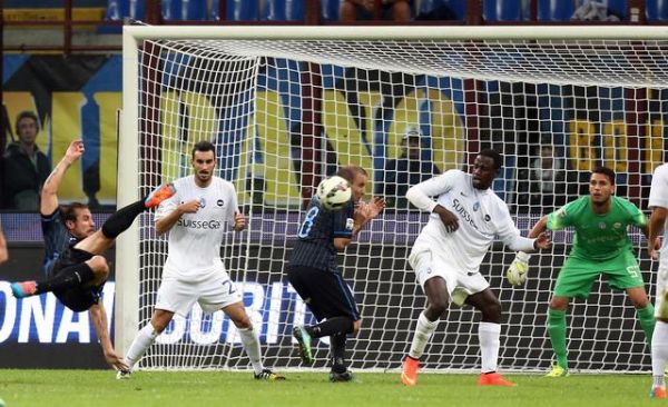 Milano, 24 settembre 2014 - IV° giornata Inter - Atalanta 2-0 Inter: Handanovic, Ranocchia, Vidic, Juan Jesus, Jonathan, Guarin (65' Hernanes), Medel, Kovacic, Dodò, Palacio (74' M'Vila), Icardi (25' Osvaldo). A disposizione: Carrizo, Andreolli, Campagnaro, Kuzmanovic, Obi, Mbaye, D'Ambrosio, Krhin, Nagatomo. Allenatore: Walter Mazzarri Atalanta: Sportiello, Zappacosta, Benalouane, Cherubin, Dramé, D'Alessandro (51' Gomez), Cigarini, Carmona, Estigarribia, Bianchi (73' Denis), Moralez (51' Boakye). A disposizione: Avramov, Del Grosso, Scaloni, Bellini, Raimondi, Migliaccio, Baselli, Biava, Molina. Allenatore: Stefano Colantuono Reti: 40' Osvaldo, 86' Hernanes Arbitro: Andrea Gervasoni di Mantova; Assistenti: Preti e Passeri; Assistenti addizionali: Tagliavento e Ghersini; IV° uomo: Cariolato Note: spettatori 35.000 circa; ammoniti: 28' Carmona, 74' Kovacic, 89' Boakye; angoli 11 a 6 per l' Atalanta; recupero pt 3', st 3' MILANO - Inizio d'incontro al piccolo trotto con la squadra di Colantuono che tenta di rendersi pericolosa al 6' con Cigarini che prova la sassata da fuori area, Handanovic osserva il pallone andare alto sopra di sé. L'Inter cresce, minuto dopo minuto, Medel accorcia, non fa respirare e recupera palloni su palloni e sfiora il gol con un bellissimo tiro da fuori area che sfiora il palo alla destra di Sportiello. Al 16' Vidic, sugli sviluppi di un calcio d'angolo, colpisce il palo con un bel colpo di testa con Sportiello battuto. Passa un minuto e 17' Kovacic s' inventa un pallone in verticale con il contagiri per Palacio, l'attaccante entra in area e calcia di prima, Sportiello è reattivo e devia. L'Inter continua ad attaccare e Guarin serve Kovacic sulla corsa, gran tiro a giro del croato e sfera che esce alta di poco. Un minuto più tardi arriva il primo cambio per l'Inter: esce Icardi per una botta, entra Osvaldo. Al 28' l'arbitro Gervasoni vede una trattenuta netta di Carmona su Ranocchia è rigore, tira Palacio, Sportiello intuisce e respinge. Al 40' calcio d'angolo per l'Inter, Osvaldo si libera della marcatura e in sforbiciata manda il pallone alle spalle di Sportiello inutilmente proteso in volo, Inter in vantaggio. Minuti di recupero, Medel calamita l'ennesimo pallone e ovazione dell'intero stadio. Ripresa che inizia con l'Atalanta che prova a partire forte per tentare di pareggiare ma è l' Inter ad andare vicino al raddoppio al 53': Osvaldo dal lato corto dell'area serve un pallone precisissimo a Palacio, gran tiro in diagonale dell'attaccante argentino e pallone che si stampa sul palo. l' Atalanta non sta a guardare e Gomez impegna Handanovic con un tiro dalla distanza. Al 69' tocca ad Estigarribia spaventare i nerazzurri ma il suo colpo di testa, su assist di Gomez, esce di poco alla sinistra dell'estremo difensore nerazzurro. L'Inter cerca di addormentare la partita, si rende pericolosa con Kovacic, all' 80' e con Medel subito dopo. All' 86' azione di Osvaldo e calcio di punizione dal limite conquistata dell'attaccante nerazzurro, il tiro di Hernanes, entrato al posto di un applauditissimo Guarin, è preciso e potente, pallone che bacia il palo ed gonfia la rete, è il 2-0 che chiude la partita.