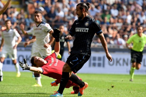 Milano, 28 settembre 2014 - V° giornata Inter - Cagliari 1-4 Inter: Handanovic, Andreolli, Vidic, Juan Jesus, Nagatomo, Hernanes, Medel (46' Guarin), Kovacic, Dodò (43' D'Ambrosio), Palacio (68' Icardi), Osvaldo. A disposizione: Carrizo, Berni, Kuzmanovic, Obi, Ranocchia, Mbaye, Puscas, Krhin, M'Vila. Allenatore: Walter Mazzarri Cagliari: Cragno, Balzano, Ceppitelli, Rossettini, Avelar, Dessena (89' Joa Pedro), Crisetig, Ekdal, Ibarbo (68' Farias), Sau (73' Longo), Cossu. A disposizione: Carboni, Murru, Caio Rangel, Pisano, Donsah, Capuano. Allenatore: Zdenek Zeman Reti: 9' Sau, 17' Osvaldo, 29', 34' e 44' Ekdal Arbitro: Luca Banti di Livorno; Assistenti: Barbirati e Gava; Assistenti addizionali: Tommasi e, Minelli; IV° uomo: Iori Note: spettatori 37.000 circa; ammoniti: 25' e 27' Nagatomo, 45' Sau, 45' Rossettini, 82' Guarin, 82' Balzano; al 27' espulso Nagatomo; angoli 8 a 3 per l' Inter; recupero pt 3', st 3' MILANO - Inizio d'incontro piuttosto equilibrato con la squadra di Zeman che gioca un calcio d'attacco trovando il gol al 9' minuto: lancio dalla metà campo cagliaritana, Sau scappa in fuorigioco con Nagatomo che tocca la sfera di testa, il cagliaritano si presenta tutto solo davanti a Handanovic e con un bel tiro in controbalzo lo batte inesorabilmente. L'Inter reagisce e all' 11' Palacio ha l'occasione per pareggiare ma, da dentro l'area, calcia debolmente. Al 17' giunge il gol del pareggio nerazzurro: fallo di Ceppitelli al limite su Palacio il quale batte la relativa punizione immediatamente, difesa del Cagliari sorpresa e pallone ad Osvaldo che anticipa Cragno in uscita e deposita la sfera in rete. Al 24' Nagatomo trattiene Cossu è punizione ma il cartellino giallo sventolato al nerazzurro sembra eccessivo. Passano tre minuto e Banti sventola per la seconda volta il cartellino giallo a Nagatomo, il giapponese viene punito per un fallo ancora su Cossu e viene così espulso, Inter in dieci. Due minuti più tardi il Cagliari passa in vantaggio: Dessena calcia di prima dal limite dell'area con Handanovic che respinge, sulla ribattuta i difensori nerazzurri non sono reattivi, arriva Ekdal e pallone in rete. L'Inter accusa il colpo, il Cagliari ne approfitta e segna il terzo gol ancora con Ekdal: Ibarbo semina il panico sulla destra, salta Medel e Dodò, giunge sul fondo e mette la sfera in mezzo per Ekdal che, con la porta spalancata, non sbaglia, siamo al 34' minuto. L'Inter tenta di reagire, perde Dodò per un problema al ginocchio e al 42' Sau si procura un calcio di rigore su intervento di Vidic, Handanovic para il tiro di Cossu e pallone in angolo, dagli sviluppi del calcio d'angolo si forma una mischia in area nerazzurra, nessuno che spazza via la palla che giunge ad Ekdal che segna ancora per la sua tripletta personale. Nel secondo tempo, l'Inter prova ad accelerare i tempi per tentare la rimonta. Al 51' gol di Osvaldo annullato per fuorigioco e al 56' è Palacio a impegnare Cragno su cross di D'Ambrosio. I nerazzurri sono aggressivi e su calcio piazzato provano a sfruttare anche i centimetri del reparto difensivo ma non è giornata e piano piano la veemenza offensiva iniziale si affievolisce. Il Cagliari amministra sfruttando la superiorità numerica e la partita non si riapre. Dopo tre minuti di recupero il sig. Banti fischia la fine dell'incontro che sancisce la prima sconfitta in campionato e in competizioni ufficiali. Osvaldo segna