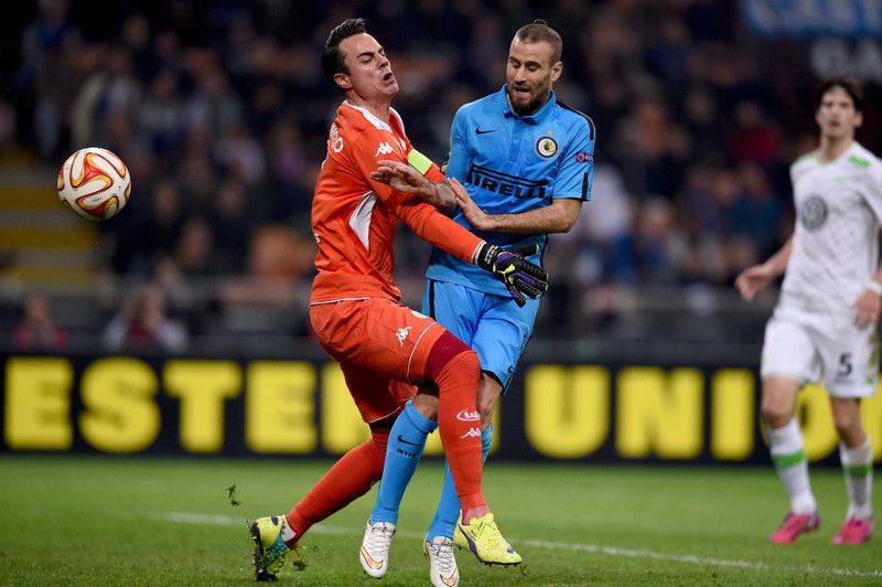 EUROPA LEAGUE 2014/15 Milano, 19 marzo 2015 - ritorno ottavi di finale Inter - Wolfsburg 1-2 Inter: Carrizo, Campagnaro (67' D'Ambrosio), Ranocchia, Juan Jesus, Santon, Guarin, Medel, Hernanes, Kovacic (54' Kuzmanovic), Palacio, Icardi. A disposizione: Handanovic, Vidic, Puscas, Shaqiri. Allenatore: Roberto Mancini Wolfsburg: Benaglio, Trasch, Klose, Knoche, Rodriguez, Guilavogui, Luiz Gustavo, Vieirinha (84' Arnold), De Bruyne, Caligiuri (73' Perisic), Dost (63' Bendtner). A disposizione: Grun, Schafer, Schurrle, Jung. Allenatore: Dieter Hecking Reti: 24' Caligiuri, 71' Palacio, 89' Bendtner Arbitro: Clattenburg Mark (Inghilterra) Note: spettatori paganti 42.041; ammonito al 83' De Bruyne, 86' Arnold, 87' Medel; angoli 6 a 5 per l'Inter; recupero pt 1', st 2'. Non c'è il tutto esaurito però i tifosi presenti spingono i nerazzurri fin dall'inizio dell'incontro e i primi 10 minuti sono una vera e propria bolgia. Al 2' Palacio in avanti per Icardi, Benaglio blocca in uscita bassa, al 3' traversone di Santon con Hernanes che giunge, sul pallone, con un attimo di ritardo e al 4' Hernanes si muove benissimo sulla tre quarti, si crea lo spazio e lascia partire un gran bel tiro, Benaglio è attentissimo e devia in angolo. Al 6' prima azione in contropiede degli ospiti, Vieirinha traversa per Caligiuri che tira altissimo. Al 9' ancora una azione in contropiede del Wolfsburg, Dost si presenta solo davanti a Carrizo il quale si allunga a terra e carpisce la sfera all'attaccante tedesco. L'Inter avanza, tenta di aggredire l'avversario e al 23' Icardi ha l'occasione per portarla in vantaggio: tiro di Guarin, pallone che deviato giunge sul destro di Icardi il quale tira prontamente sul palo più lontano, Benaglio è in serata di grazia e riesce a deviare. La legge del calcio non sbaglia quasi mai, gol mancato e gol subito e infatti neanche un minuto dopo il Wolfsburg passa in vantaggio: De Bruyne se ne va sulla destra, traversone per Caligiuri che anticipa Juan Jesus, si presenta solo davanti a Carrizo e mette il pallone in rete malgrado il disperato tentativo del portiere nerazzurro. L'Inter accusa il colpo e non riesce a rendersi pericolosa sino al 44' quando il pallone giunge a Guarin il quale, da due passi dalla linea di porta, si vede intercettare, incredibilmente, la sfera da un insuperabile Benaglio. La ripresa si apre ancora con il Wolfsburg in avanti e al 49' costringe, ancora una volta, all'uscita provvidenziale di Carrizo su Dost. Cambio Kuzmanovic per Kovacic e l' Inter tenta di scuotersi, al 60' Hernanes anticipa tutti di testa, su traversone di Palacio, ma non trova la porta. Passa un minuto ed è Guarin a provarci dalla distanza e al 67' Benaglio si erge ancora una volta da protagonista: Palacio si esibisce in una bellissima azione personale, s'incunea in area e tira sul primo palo, il portiere tedesco è reattivo e devia il pallone con il piede destro. L'Inter non è certo fortunata in questo periodo della stagione e lo si capisce anche al 68', con l'ennesima conclusione di Hernanes che, a termine di una percussione centrale, manda il pallone a lato di poco. Al 71' arriva finalmente il meritato pareggio nerazzurro: azione iniziata da Kuzmanovic, scambio tra Hernanes e Palacio e gol dell'argentino che batte, finalmente, Benaglio in uscita. Si riaccendo le speranze, i tedeschi hanno un attimo di sbandamento ma è il solo Kuzmanovic a rendersi pericoloso con due conclusioni che meritavano un pizzico di fortuna in più. Con il passar del tempo le folate offensive dell'Inter si esauriscono ed a un minuto della fine giunge anche il gol beffa di Bendtner che su assist di Arnold fissa il punteggio finale sul 2 a 1 per gli ospiti.