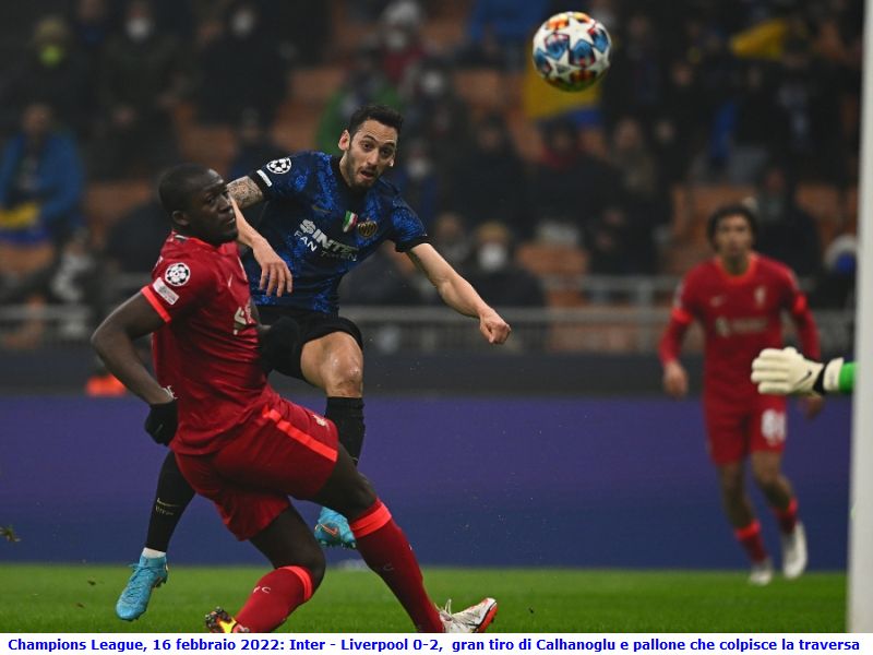 CHAMPIONS LEAGUE 2021/22 Milano, 16 febbraio 2022 - andata ottavi di finale Inter - Liverpool 0-2 Inter: Handanovic, Skriniar, De Vrij (87' Ranocchia), Bastoni (91' Dimarco), Dumfries (87' Darmian), Vidal (87' Gagliardini), Brozovic, Calhanoglu, Perisic, Lautaro Martinez (70' Sanchez), Dzeko. A disposizione: Cordaz, Radu, D'Ambrosio, Sangalli, Caicedo, Carboni. Allenatore: Simone Inzaghi. Liverpool: Alisson, Alexander-Arnold, Konaté, Van Dijk, Robertson, Thiago Alcantara (86' Milner), Fabinho (59' Henderson), Elliot (59' Keita), Salah, Jota (46' Firmino), Mané (59' Diaz). A disposizione: Kelleher, Gomez, Matip, Tsimikas, Oxlade-Chamberlain, Minamino, Origi. Allenatore: Jürgen Klopp Rete: 75' Firmino, 83' Salah Arbitro: Szymon Marciniak (Polonia); assistenti P. Sokolnicki e T. Listkiewicz; IV° uomo P. Raczkowski; VAR T. Kwiatkowski e B. Frankowski Note: spettatori 37.918 (capienza ridotta a causa COVID-19); angoli 7 per parte; nessun ammonito; recupero pt 2', st 3' L' incontro è iniziato da appena cinque minuti e prima occasione pericolosa per l' Inter: Dumfries riesce a controllare la palla fuori area che viene respinta dalla difesa del Liverpool, sfera che giunge a Lautaro Martinez, tiro di destro da fuori area e pallone che esce di poco a lato. Passano quattro minuti e il Liverpool va alla conclusione con Thiago Alcantara che, al volo da fuori area, manda la sfera di poco alta sopra la traversa. Passano cinque minuti e colpo di testa di Manè, dal secondo palo, con palla alta sulla traversa. Ancora due minuti e clamorosa occasione per l' Inter: Perisic si invola sulla sinistra ed effettua un traversone sul primo palo dove arriva Calhanoglu che controlla e tira di sinistro, Alisson è battuto ma la sfera colpisce la traversa. Al 23' calcio d' angolo per il Liverpool, colpo di testa di Konaté, rovesciata di Manè e pallone che termina alto sulla traversa. E' l' ultima azione di una certa pericolosità del primo tempo che dopo due minuti di recupero, termina a reti in bianco. La ripresa inizia con l' Inter più intraprendente e al 60' Vidal serve Dzeko il quale mette in rete la sfera, ma il punto è annullato per fuorigioco dell' attaccante nerazzurro. Al 71' Dzeko spreca una ottima occasione, solo davanti alla porta riesce a guadagnandosi soltanto un calcio d' angolo, e al 73', sugli sviluppi di un calcio d' angolo battuto da Calhanoglu, colpo di testa di Dumfries e pallone che non trova la porta di un nonnulla. Al 75' il Liverpool passa in vantaggio: traversone di Robertson, colpo di testa di Firminio e palla in fondo al sacco. L' Inter tenta di reagire all' immeritato svantaggio e all' 80' Vidal serve Sanchez che tira prontamente, pallone che viene respinto dai difensori avversari e che giunge a Perisic che calcia di prima intenzione, il tiro sembra vincente ma la sfera termina a lato di poco. Passano tre minuti e traversone dalla destra da parte di Alexander-Arnold, colpo di testa di Van Dijk, respinta da parte di un difensore nerazzurro e sfera che giunge a Salah che tira di prima intenzione e batte per la seconda volta Handanovic. Tre minuti di recupero e fine dell' incontro che vede il Liverpool sbancare San Siro con il risultato di 2 a 0.