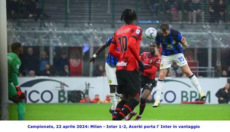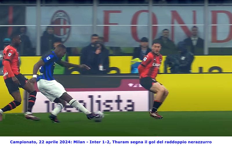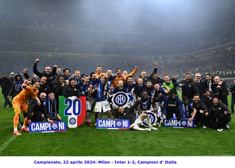 Milano, 22 aprile 2024 - XXXIII° giornata Milan - Inter 1-2 Milan: Maignan, Calabria, Gabbia, Tomori, Theo Hernández, Adli (69’ Chukwueze), Reijnders (52’ Giroud), Musah (77’ Okafor), Loftus-Cheek (69’ Bennacer), Pulisic, Leão. A disposizione: Nava, Sportiello, Caldara, Florenzi, Terracciano, Jovic. Allenatore: Stefano Pioli Inter: Sommer, Pavard, Acerbi, Bastoni (88’ De Vrij), Darmian (84’ Dumfries), Barella (77’ Frattesi), Çalhanoglu (84’ Asllani), Mkhitaryan, Dimarco (77’ Carlos Augusto), Thuram, Lautaro Martínez. A disposizione: Audero, Di Gennaro, Bisseck, Buchanan, Cuadrado, Klaassen, Sensi, Arnautovic, Sánchez. Allenatore: Simone Inzaghi Reti: 18’ Acerbi, 49’ Thuram, 80’ Tomori Arbitro: Andrea Colombo di Como; assistenti Meli e Alassio; IV° uomo Massa; addetti VAR Marini e Mariani Note: spettatori 75.554; angoli 5 a 3 per il Milan; ammonito al 22’ Barella, 32’ Lautaro Martinez, 36’ Theo, 88’ Inzaghi, 90’ Gabbia, 92’ Tomori; espulsi al 94’ Theo Hernandez, 94’ Dumfries, 97' Calabria; recupero pt 1' e st 5' Inizio d' incontro a ritmi bassi con le due squadre che si controllano a vicenda e con la prima conclusione, verso una porta, che giunge solo all' ottavo minuto: traversone dalla sinistra di Bastoni, Darmian appoggia all' indietro per Lautaro Martinez, tiro di destro, di prima intenzione, dell' attaccante nerazzurro e pallone che termina alto sopra la traversa. Al 17' Thuram si fa largo in area di rigore rossonera, salta Gabbia e traversa basso verso il centro con Tomori che devia in calcio d' angolo. Calcio d' angolo battuto da Dimarco, colpo di testa di Pavard che allunga la traiettoria verso Acerbi che, sempre di testa, mette la sfera in fondo alla rete. Inter che passa in vantaggio. Il Milan cerca di reagire al gol dello svantaggio ma è l' Inter a sciupare l' occasione del raddoppio al 25': colpo di tacco di Thuram che libera la sovrapposizione di Dimarco, traversone di quest' ultimo, teso, verso il centro dell' area di rigore avversaria dove si trova Lautaro Martinez che, con la porta a pochi passi, calcia malissimo e mette la sfera, incredibilmente, sul fondo. Al 29' contropiede da parte del Milan con Musah che verticalizza per Leao il quale entra in area di rigore nerazzurra, salta Acerbi e calcia di sinistro, Sommer è prontissimo e respinge la sfera. Al 38' Barella entra in area di rigore del Milan e serve Thuram all' altezza del dischetto di rigore, tiro di prima intenzione dell' attaccante nerazzurro e pallone che esce fuori scheggiando il palo di destra. Al 40' bellissima conclusione da parte di Calabria con Sommer che vede il pallone all' ultimo momento e lo respinge a lato. Cambio di fronte d' attacco e tiro, da dentro l' area di rigore, da parte di Mkhitaryan con Maignan che respinge la sfera. Un minuto di recupero e prima frazione di gioco che termina con l' Inter in vantaggio di una rete a zero. La ripresa inizia con un Inter votata all' attacco e che al 49' raddoppia: lancio di Barella verso Thuram il quale difende bene il pallone, si accentra lungo la linea dell' area di rigore e lascia partire un tiro di destro rasoterra che manda la sfera verso l' angolino di sinistra, Maignan non ci arriva e palla che termina in rete. Al 51' tiro da parte di Theo Hernandez dal limite dell' area con Sommer che respinge centralmente la sfera, palla che giunge a Loftus-Cheek che, in girata, la mette fuori. Al 72' calcio d' angolo per l' Inter, batte Calhanoglu, palla verso il primo palo dove Pavard la gira di testa mandandola alta sulla traversa. Al 74' Leao tocca dentro l' area nerazzurra per Pulisic il quale stoppa la palla e conclude di sinistro mandando la sfera alta sopra la traversa. All' 80' calcio d' angolo per il Milan, palla che termina, al limite dell' area, a Chuckwueze il quale traversa verso il secondo palo dove si trova Leao che fa da sponda per Gabbia, colpo di testa del difensore rossonero e incredibile respinta di Sommer che manda la palla sul palo, sulla ribattuta il più lesto di tutti è Tomori che di testa, a porta vuota, mette la palla in rete. Milan che accorcia le distanze. All' 83' palla vagante in area di rigore nerazzurra con Bastoni che aspetta l' uscita di Sommer, Okafor anticipa tutti e colpisce la palla con la punta, la stessa lentamente va verso la porta nerazzurra dove viene allontanata, a pochi passi dalla linea di porta, da Pavard. Cinque minuti di recupero, poi diventati otto, nei quali il Milan si conquista due calci d' angolo, con tre espulsioni e con l' Inter che riesce a rintuzzare gli attacchi dei rossoneri. Al 98' triplice fischio del sig. Colombo, Inter batte Milan 2 a 1 e Inter che è Campione d' Italia con 5 giornate d' anticipo.