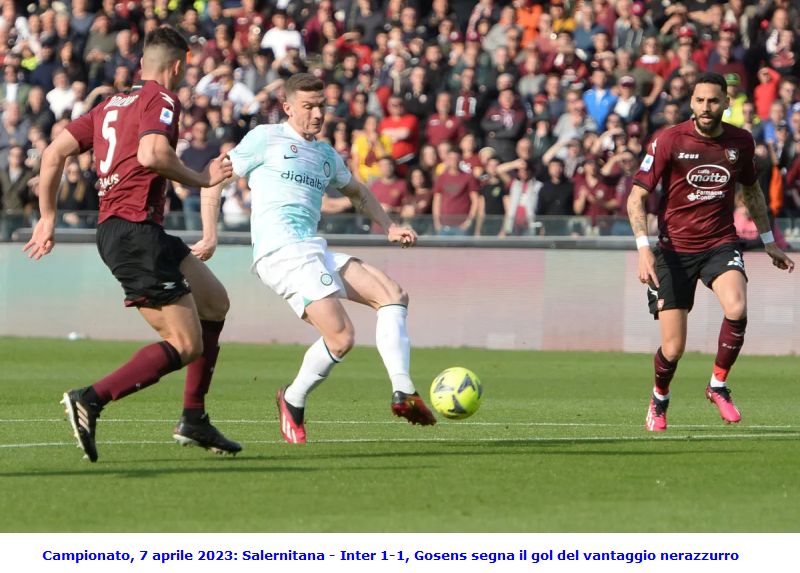 Salerno, 7 aprile 2023 - XXIX° giornata Salernitana - Inter 1-1 Salernitana: Ochoa, Bronn (46’ Dia), Bradaric, Daniliuc, Vilhena (80’ Bohinen), Coulibaly (65’ Nicolussi Caviglia), Kastanos (85’ Botheim), Gyomber, Candreva, Pirola (65’ Troost-Ekong), Piatek. A disposizione: Sepe, Fiorillo, Sambia, Bonazzoli, Valencia, Iervolino, Lovato. Allenatore: Paulo Sousa Inter: Onana, Dumfries, De Vrij, Gosens (75’ Dimarco), Correa (66’ Lautaro Martinez), Asllani (66’ Brozovic), Acerbi, Mikhytarian, Barella (66’ Gagliardini), Darmian, Lukaku (85’ Dzeko). A disposizione: Handanovic, Boris, Bellanova, Carboni, Zanotti, Bastoni. Allenatore: Simone Inzaghi Reti: 6' Gosens, 90' Candreva Arbitro: Michael Fabbri di Ravenna; assistenti Bresmes e Galetto; IV° uomo Ayroldi; addetti VAR Nasca e Longo Note: spettatori 23.100; angoli 8 a 2 per l' Inter; ammonito al 34' De Vrij, 38' Coulibaly, 70' Nicolussi Caviglia, 89' Gagliardini; recupero pt 2' e st 5' Inter subito in controllo della partita e che, al sesto minuto, passa in vantaggio: verticalizzazione di Asslani per Lukaku il quale libera Gosens davanti ad Ochoa, tiro di sinistro e palla in fondo al sacco. Passano tre minuti e Correa serve Lukaku al limite dell' area, tiro di destro in diagonale e pallone che sfiora il palo ad Ochoa battuto. Al 14' colpo di testa di Gosens con palla che viene parata da Ochoa e al 23' tiro di Lukaku con il portiere di casa che para senza problemi. Al 32' traversone di Gosens, stacco di Correa che colpisce la palla di testa e Ochoa compie un grande intervento respingendo la palla stessa in tuffo. Al 43' giunge il primo tiro della Salernitana verso la porta dell' Inter, è Coulibaly a concludere dal limite con Onana che para, facilmente, a terra. Due minuti di recupero e proprio sul finire del tempo traversone di Dumfries, colpo di testa di Lukaku da distanza ravvicinata e strepitoso intervento, di coscia, da parte di Ochoa. La ripresa è iniziata da quattro minuti e azione di Barella che si porta al limite dell' area e lascia partire un bellissimo tiro con il pallone che sembra destinata in rete, ma ancora una volta Ochoa è straordinario e con le punta delle dita, riesce a deviare la sfera sul palo. Al 51' calcio d' angolo per l' Inter, colpo di testa di De Vrij sul primo palo e pallone che esce di un soffio fuori dallo specchio della porta. Al 58' traversone sbagliato da parte di Candreva con il pallone che prende uno strano effetto e costringe Onana in calcio d' angolo. Al 63' Mkhikitaryan lascia partire un gran tiro dal limite dell' area con Ochoa che alza la sfera sopra la traversa in calcio d' angolo. Dagli sviluppi del calcio d' angolo traversa colpita da Lukaku con un colpo di testa da nemmeno due metri dalla porta ed ennesimo intervento straordinario da parte di Ochoa che riesce a respingere la sfera, sul tiro di De Vrij a botta sicura, prima che la stessa superi interamente la linea bianca per questioni di millimetri. Al 71' giunge la prima vera occasione da gol della Salernitana: traversone di Candreva, tiro al volo da parte di Dia e pallone che si stampa sulla traversa. Al 78' Gyolber ribatte un tiro di Acerbi da dentro l' area, al 79' Gagliardini manda alto il pallone di testa su traversone di Dimarco e all' 82' Lautaro Martinez si divora il gol del raddoppio: Lukaku difende palla e con un magistrale tocco manda Lautaro Martinez, tutto solo, verso la porta avversaria, ma giunto davanti ad Ochoa calcia debolmente e permette la presa facile al portiere avversario. All' 84' ancora una parata da parte di Ochoa su conclusione di Lukaku e al 90' traversone sbagliato da parte di Candreva dalla linea laterale, il pallone acquisisce una traiettoria diabolica e s' infila sotto l' incrocio dei pali e termina alle spalle di un sorpreso e incolpevole Onana. Salernitana che raggiunge il pareggio. Quattro minuti di recupero, poi diventati cinque, nei quali non accade nulla di eclatante e incontro che termina con l' incredibile punteggio, per le innumerevoli occasioni da gol avute dall' Inter, di 1 a 1.